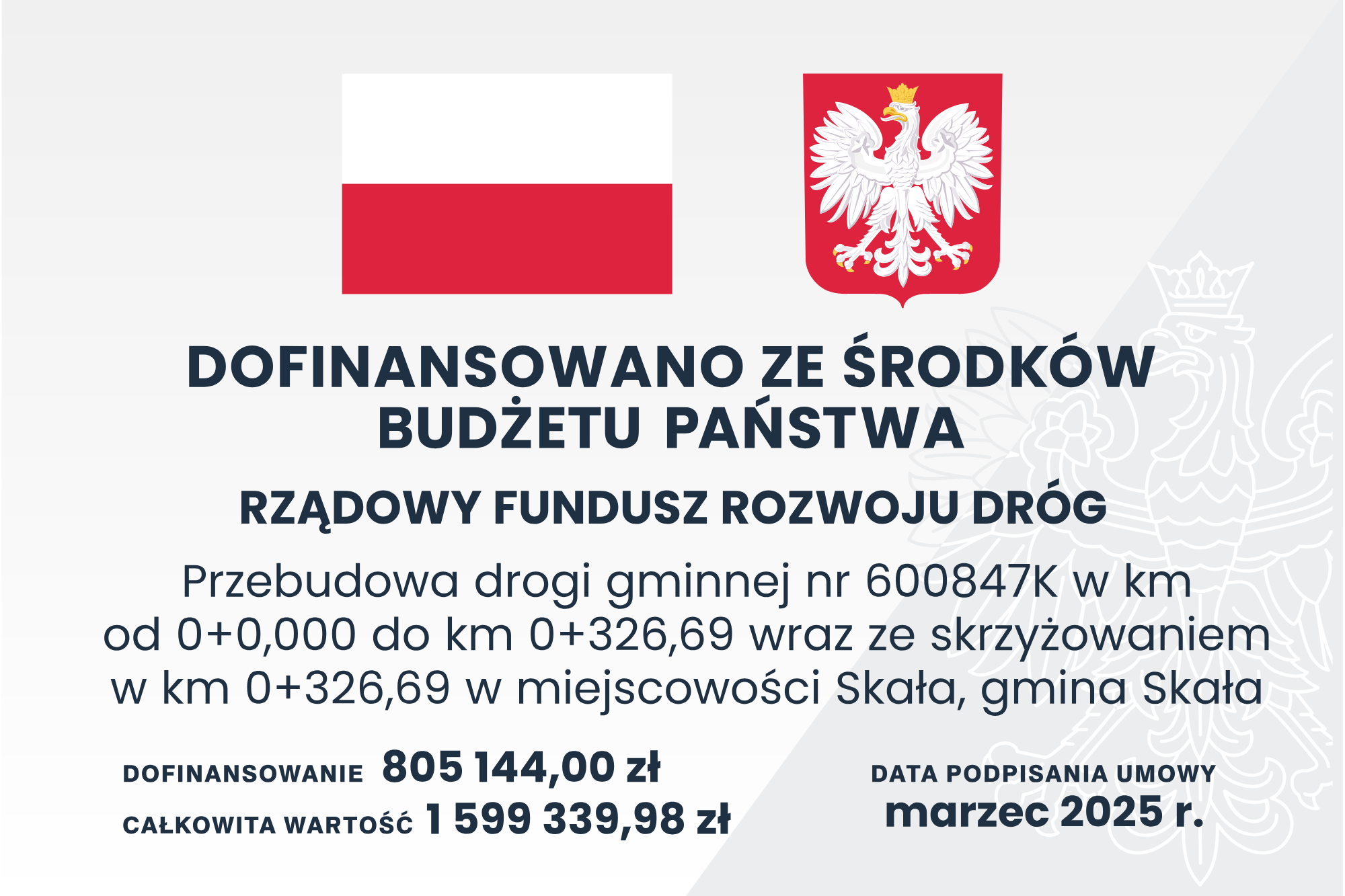 Zadanie pn. „Przebudowa drogi gminnej nr 600847K w km od 0+0,000 do km 0+326,69 wraz ze skrzyżowaniem w km 0+326,69 w miejscowości Skała, gmina Skała” jest zrealizowane z udziałem dofinansowania w ramach Rządowego Funduszu Rozwoju Dróg.