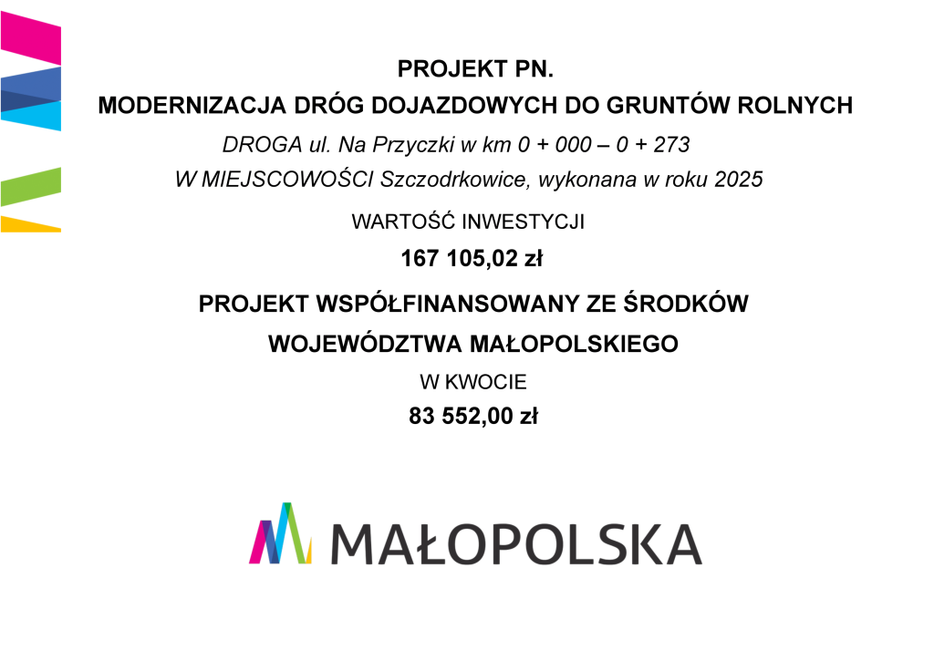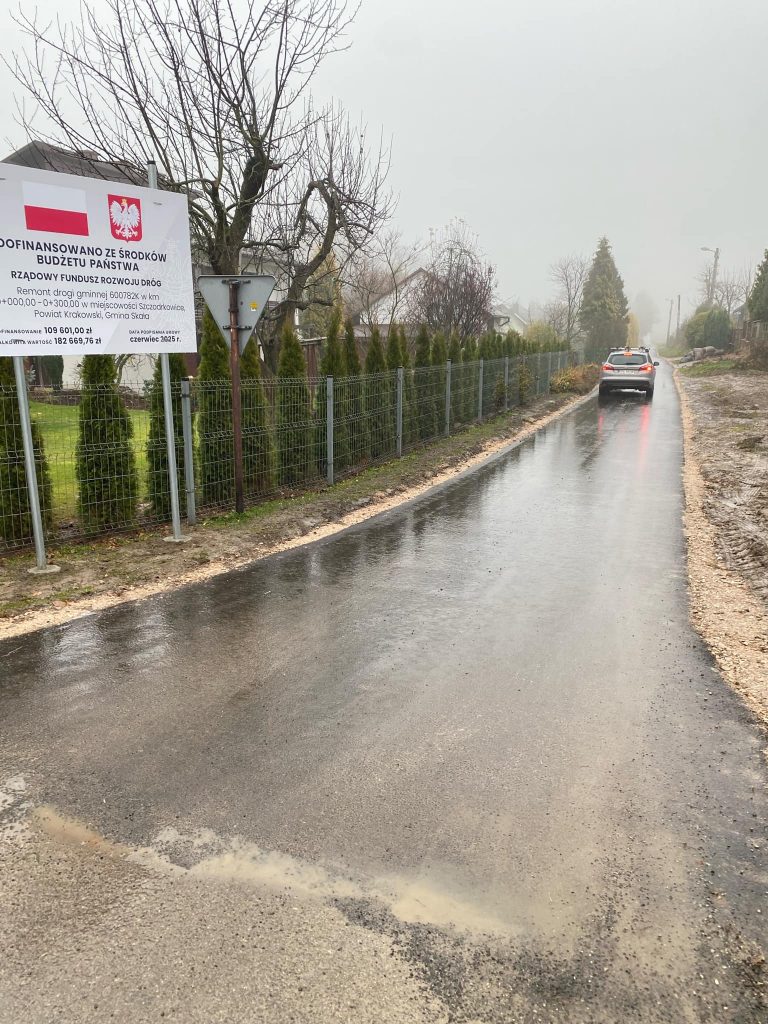 Treść: Zadanie pn. „Remont drogi gminnej 600782K w km 0+000 – 0+300 w m. Szczodrkowice, Gmina Skała zlokalizowanej na działce dr. nr ewid. 599” jest zrealizowane z udziałem dofinansowania w ramach Rządowego Funduszu Rozwoju Dróg.