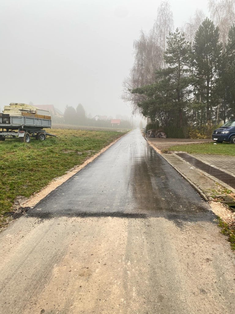 Wykonano korytowanie na gł 40 cm, wymianę podbudowy z kruszywa oraz nową nakładkę asfaltową i regulację studzienki kanalizacyjnej.