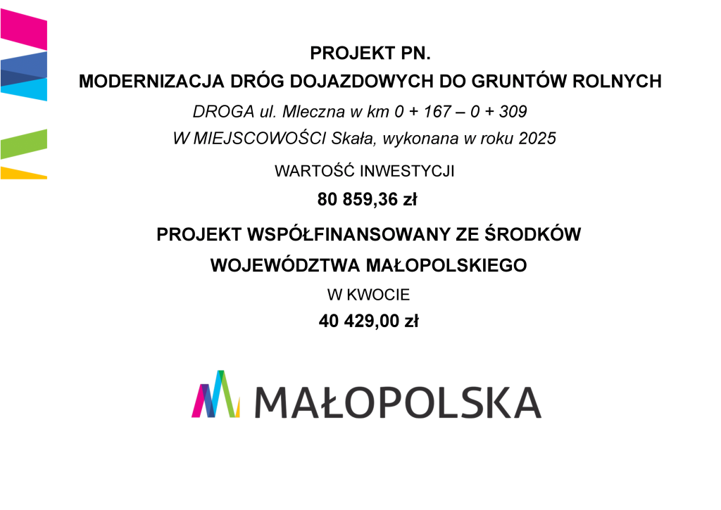 Gmina Skała otrzymała w 2025 roku dofinansowanie ze środków Województwa Małopolskiego na modernizację dróg dojazdowych do gruntów rolnych.